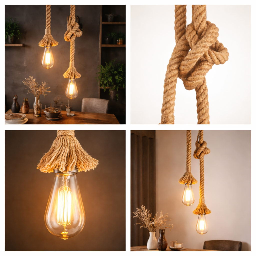 Bring rustic charm and warm ambience into your space with this custom-made hemp rope pendant light. Designed to blend natural textures with modern lighting, this fixture features premium hemp rope detailing paired with exposed filament bulbs that emit a cozy 2700K warm white glow.